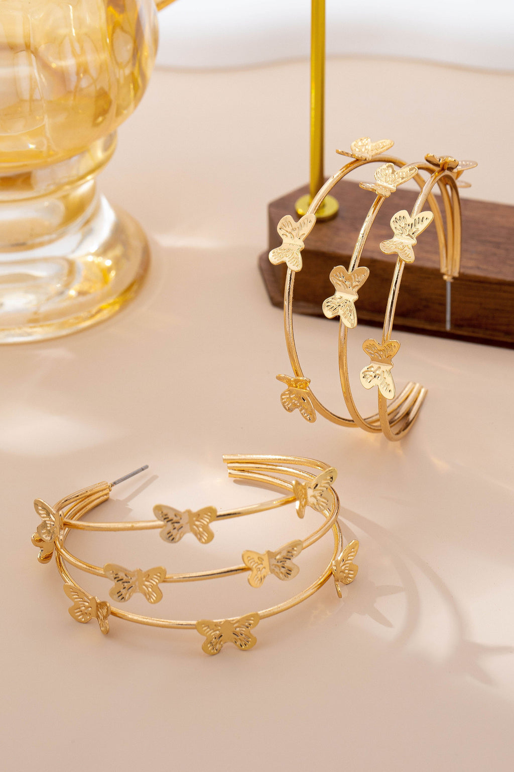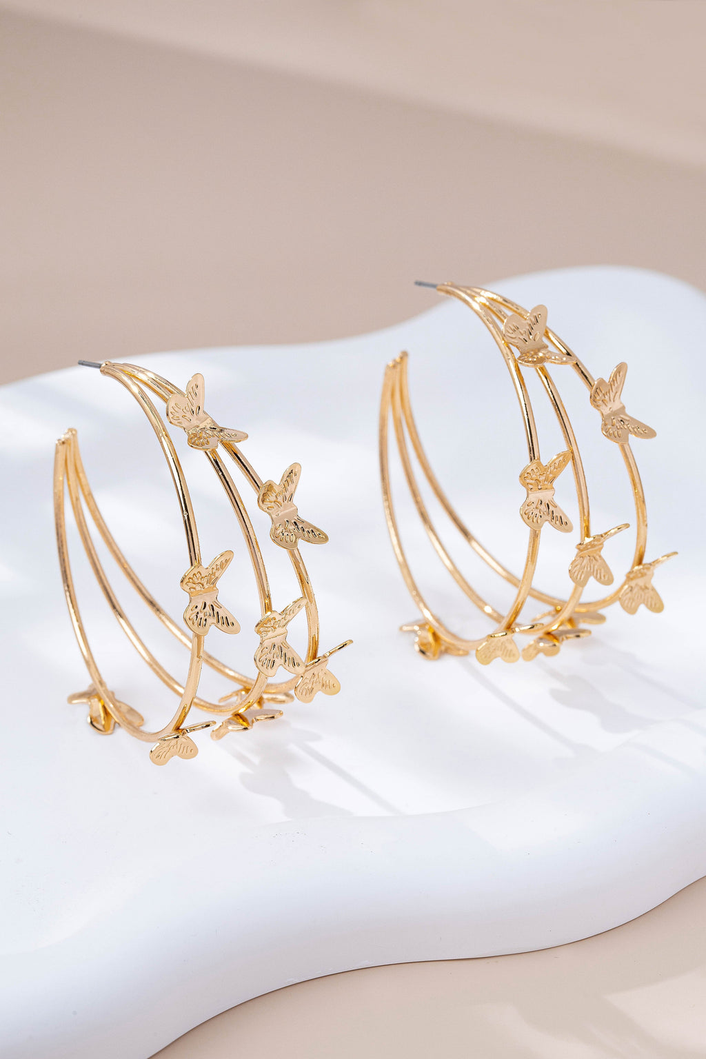 Statement-making large gold-tone triple-layer hoop earrings featuring delicate three-dimensional butterflies fluttering along polished open hoops.