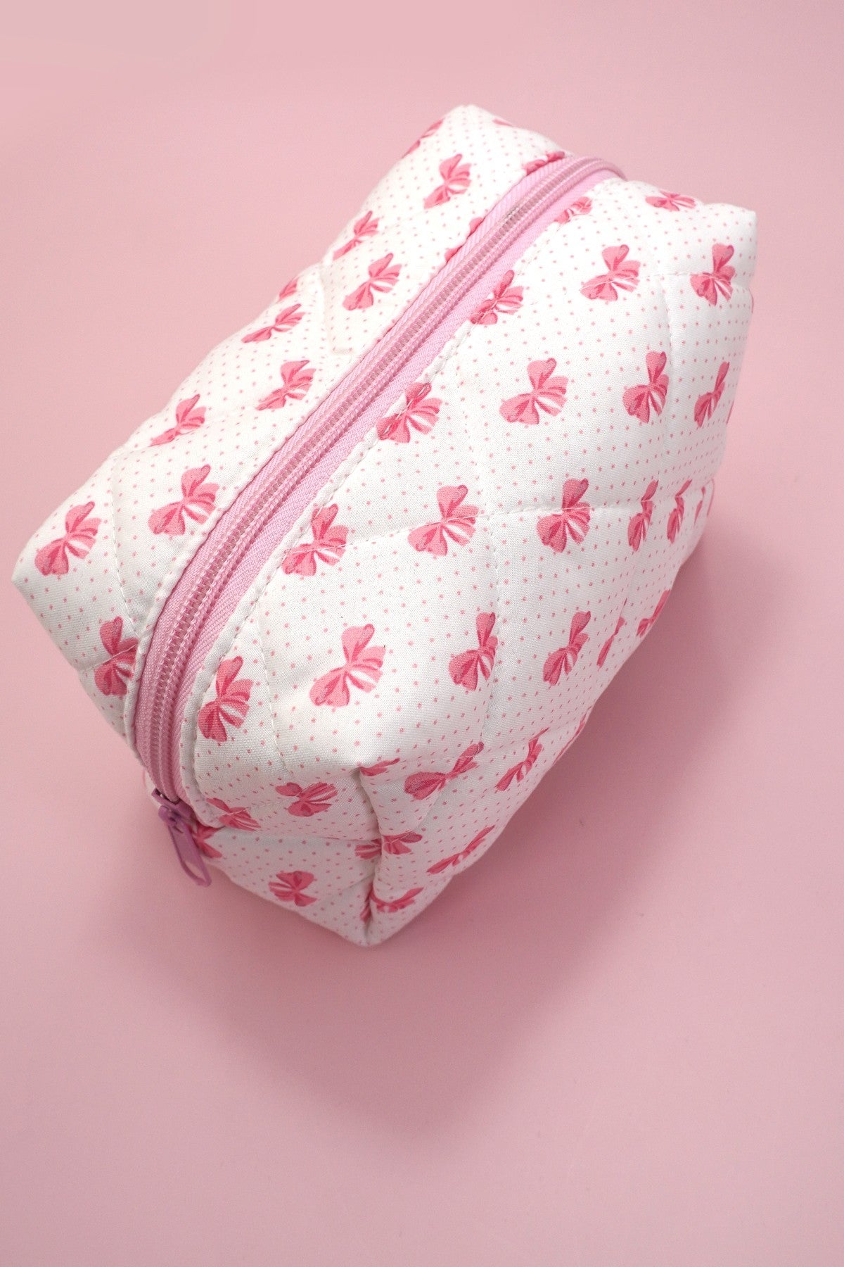 Quilted Cotton Bow Cosmetic Pouch Bag, made from soft quilted cotton, this adorable pouch features a delicate bow detail for a feminine and elegant look. Perfect for organizing makeup, skincare, or small accessories, it is lightweight, durable, and ideal for both travel and everyday use.