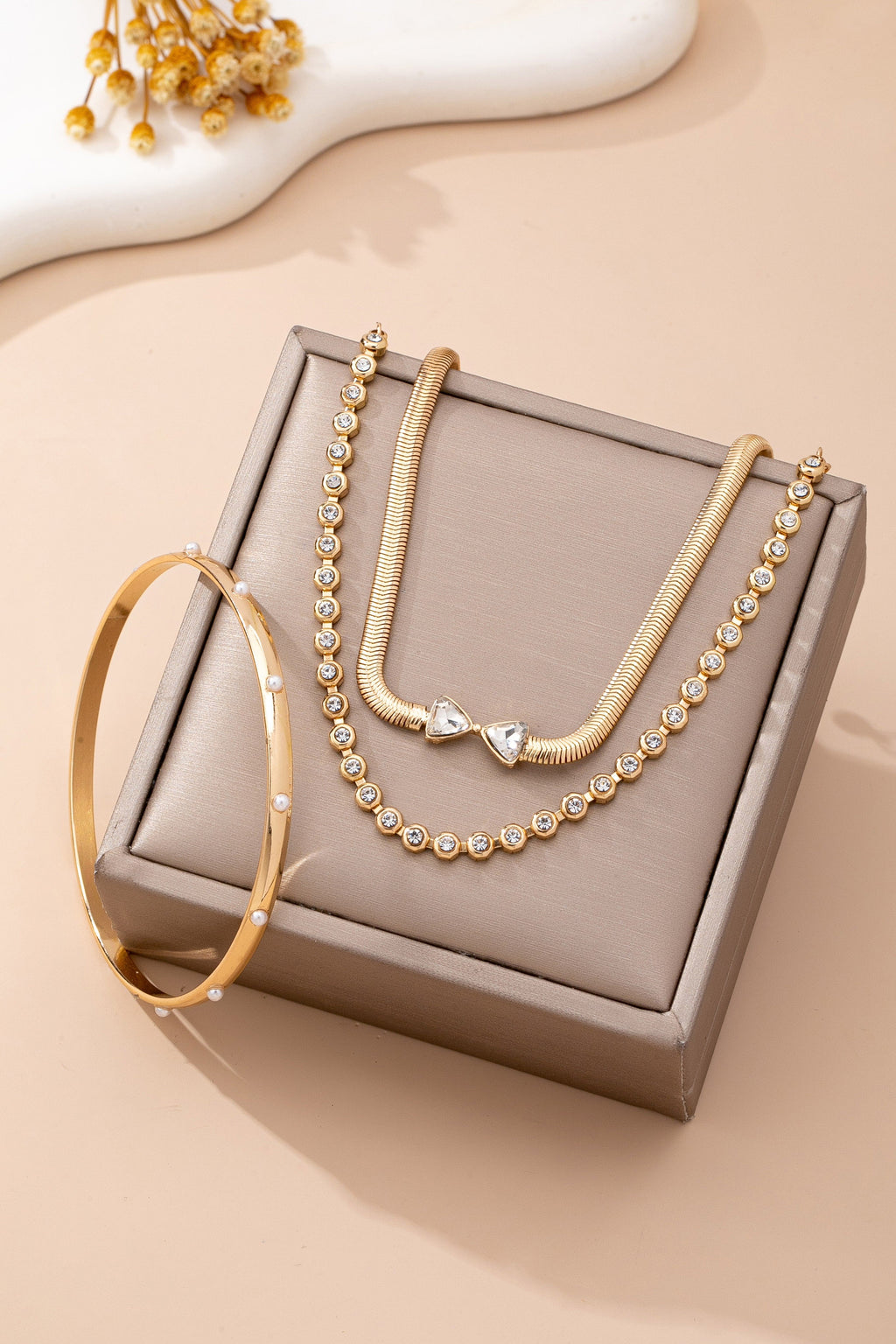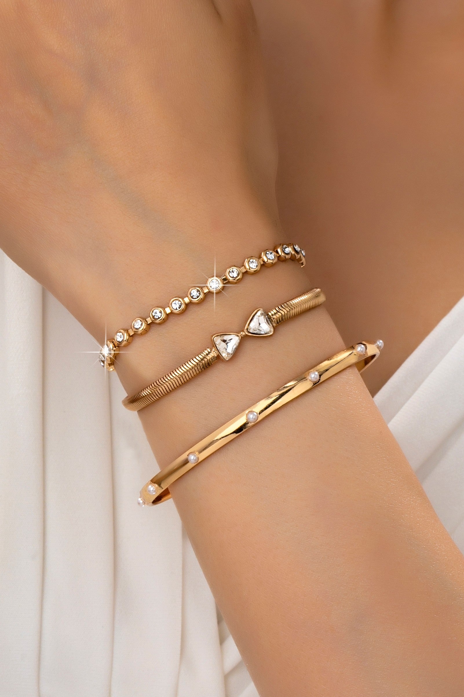 Chic multi-strand gold-tone set with herringbone chains, crystal bezels, faux pearls, and a triangle-crystal open cuff. Mix of textures and sparkle for effortless layering-adds instant glamour and modern sophistication to any wrist.