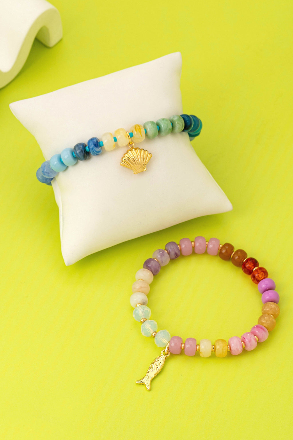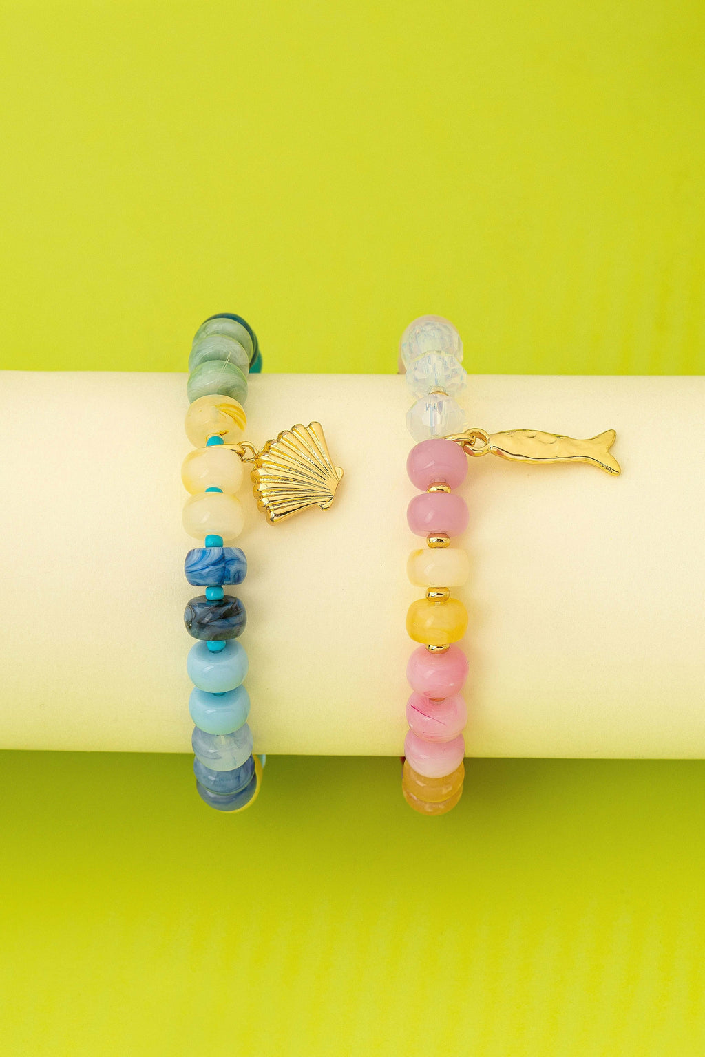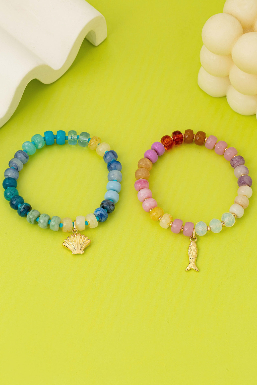 Featuring a diverse array of colorful, resin multi-tonal beads. Small gold-tone and turquoise spacers provide bright accents throughout the strands. Each bracelet is finished with a distinct features a textured, scalloped seashell, while the other holds a detailed fish pendant.