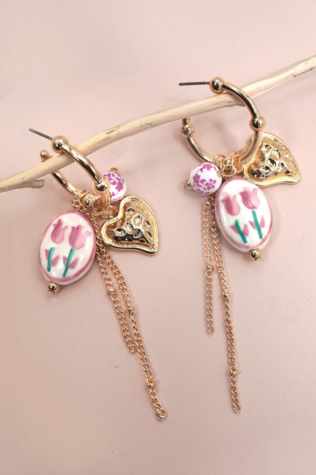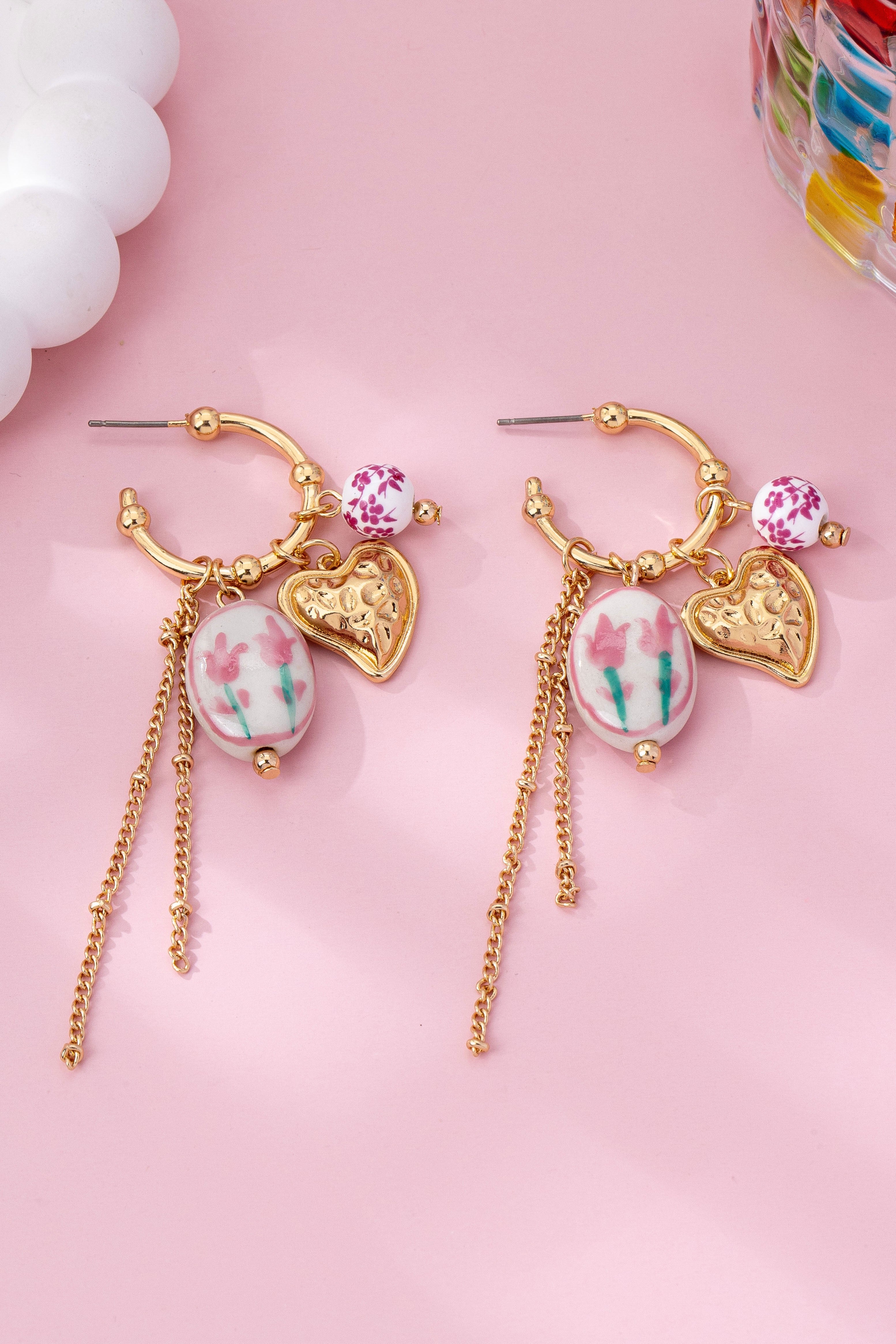 Feature gold-tone mini hoops are loaded with eclectic dangling charms: hammered heart pendants, oval porcelain beads hand-painted with delicate pink tulips, tiny white floral rounds, and swaying gold chains for movement. Romantic and whimsical, they add vintage-inspired charm