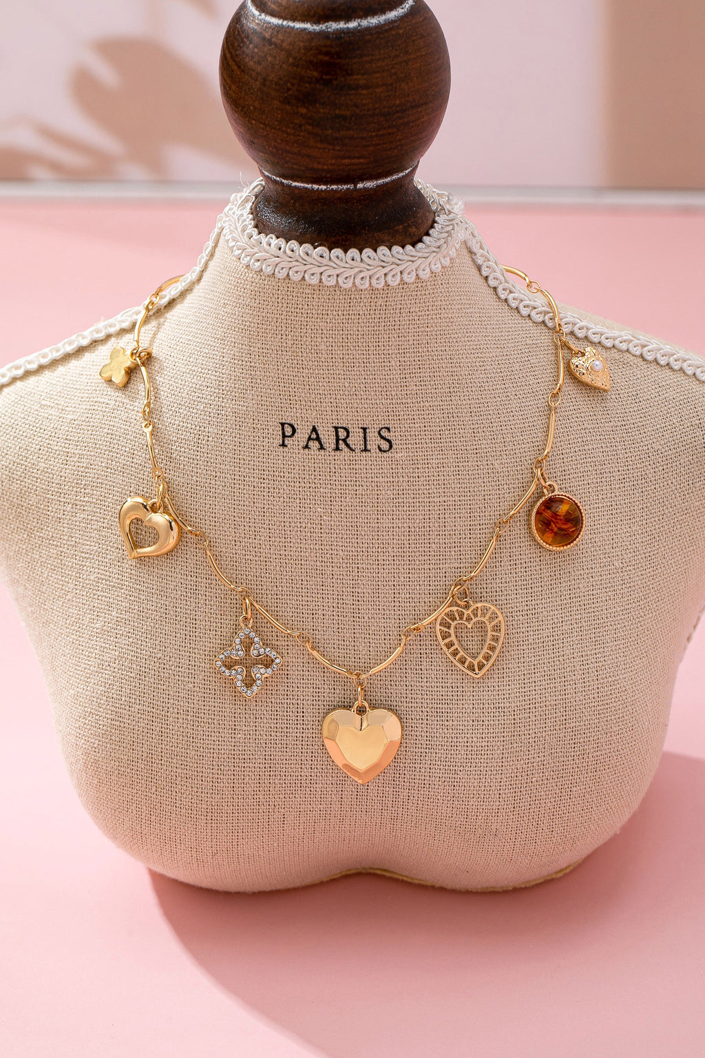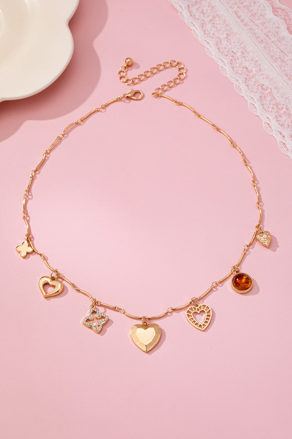 Slender bar-link chain necklace with delicate charms: small clover, open heart, pearl-embellished heart, amber round gem, puffed heart, and lattice heart. Sweet, friendship-themed mix with adjustable clasp.