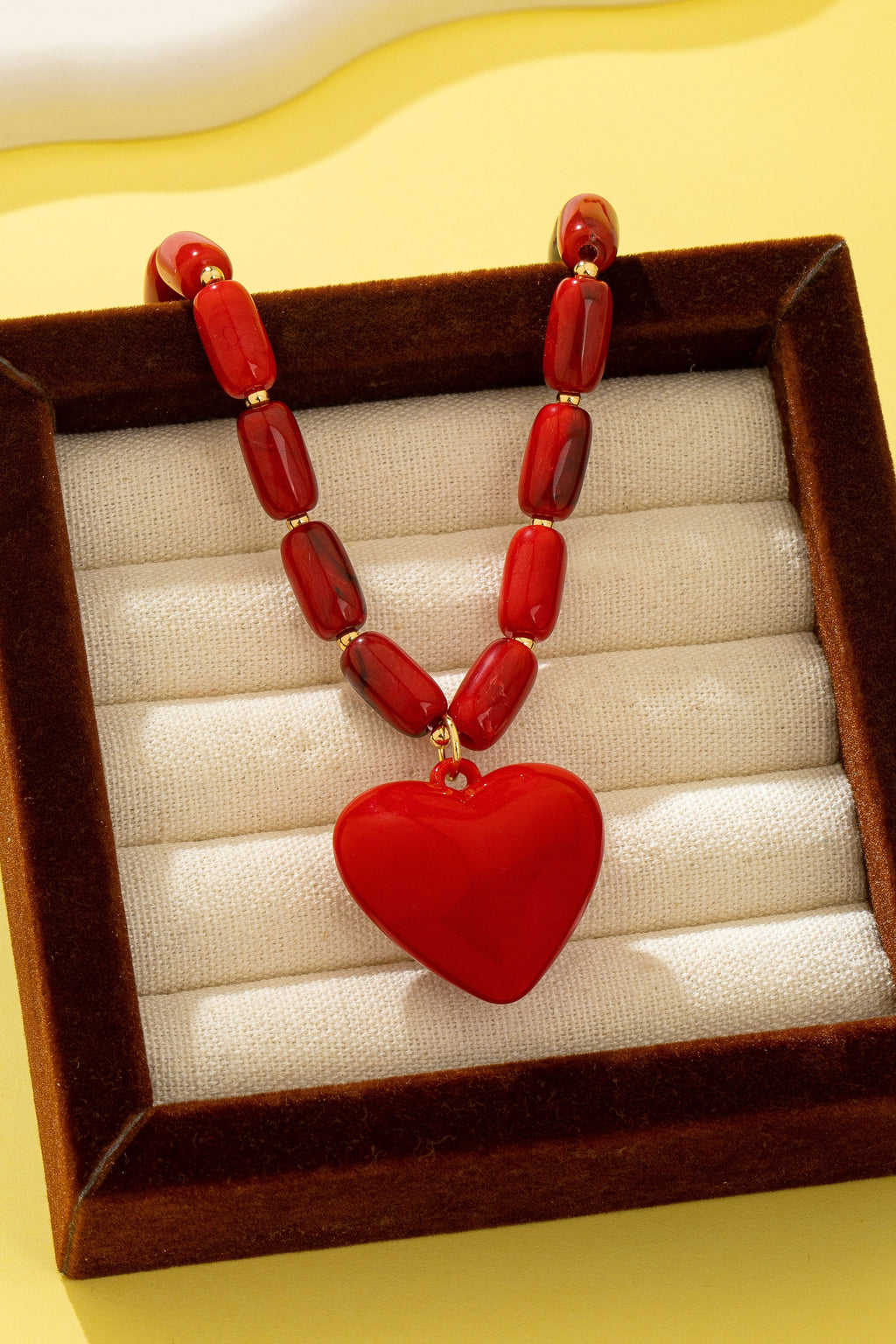 Features a monochromatic design in a deep, vibrant crimson large, puffed heart pendant suspended from the center. The heart matches the rich red hue of the beads and features a sleek, light-reflecting surface.