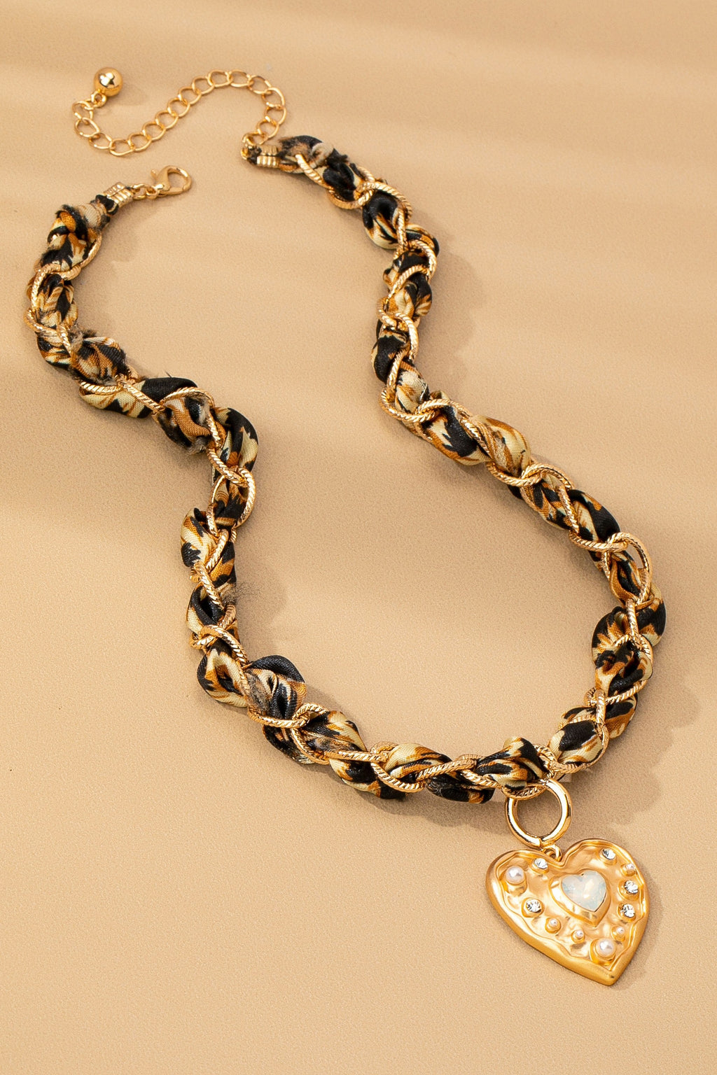 Featuring a luxurious gold-tone chain intricately woven with leopard print fabric, removable gold embossed heart pendant with rhinestones and pearl that adds a subtle romantic touch. Heart charm can be removable. Perfect gift for the holidays, including Christmas, Mother's Day, Valentine's Day.