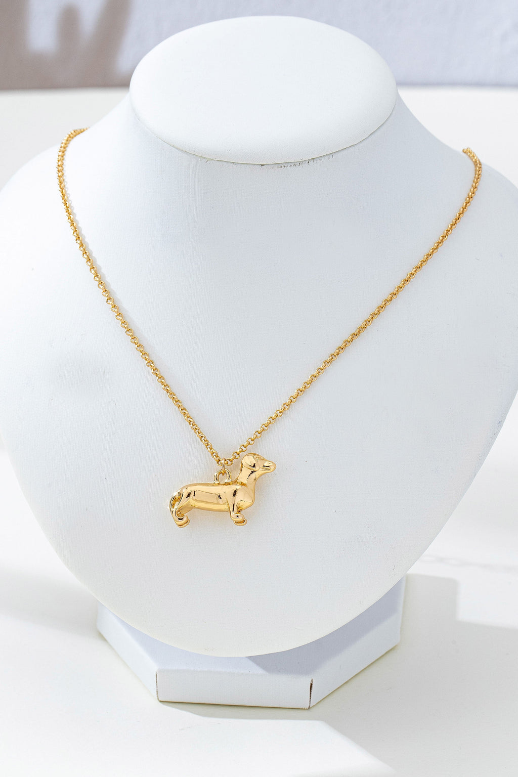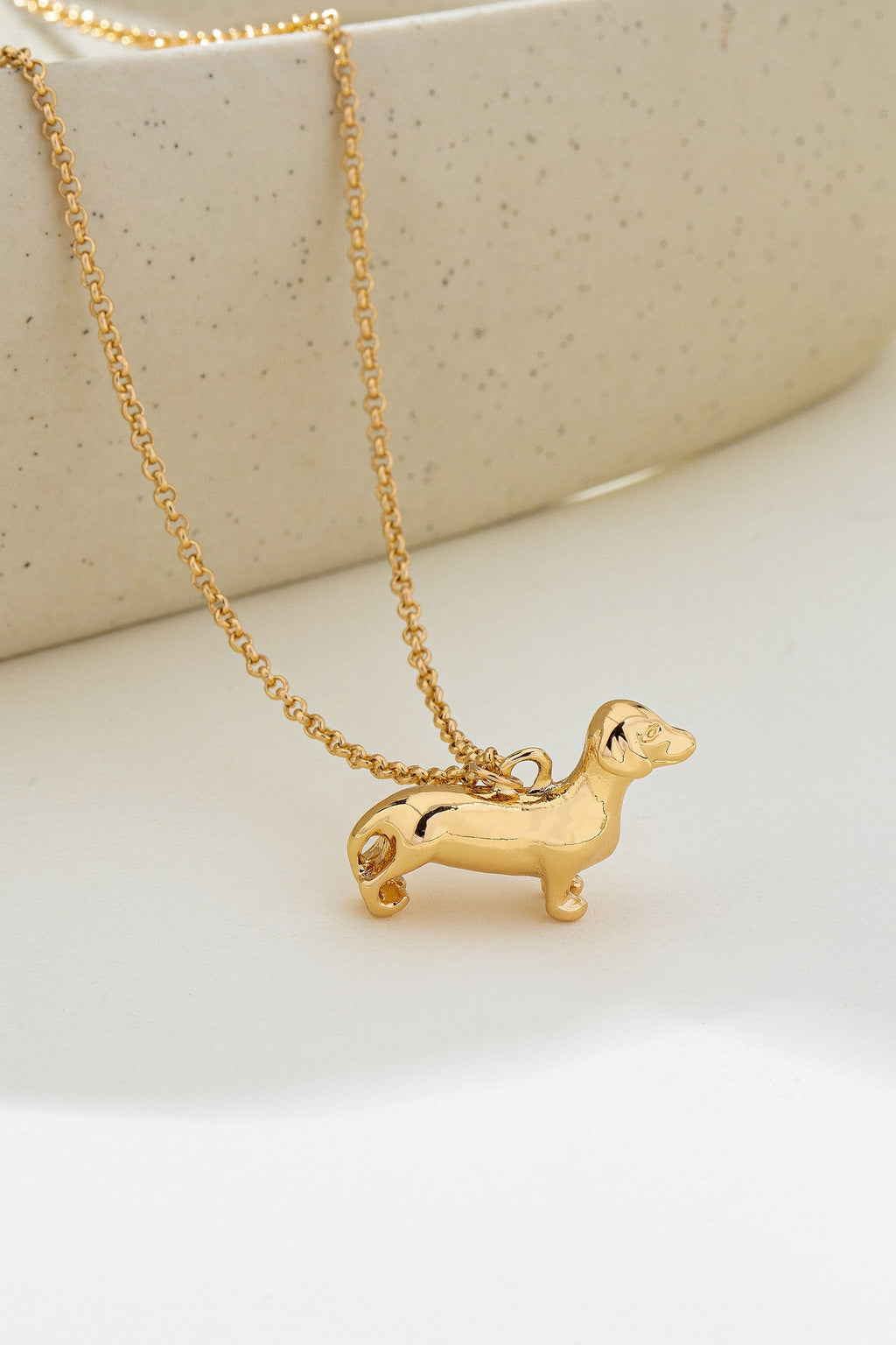 Minimalist necklace features a delicate gold-tone cable chain designed for a subtle and elegant look. A standout feature of the piece is the polished dachshund pendant, which showcases the breed's iconic long silhouette and short legs with a smooth, high-shine finish.