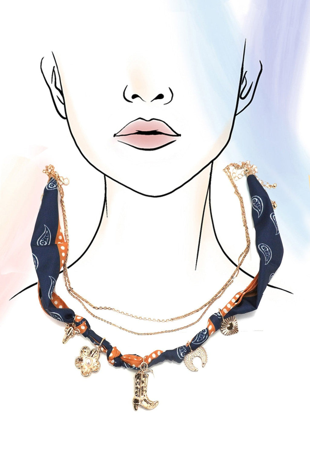 Bohemian Scarf Charm Necklace, featuring a layered with gold chain and soft scarf adorned with western-inspired charms. With a boot, heart, flower, bull this accessory brings a playful yet elegant coastal touch to any outfit. Perfect for layering over summer dresses or adding flair to everyday looks