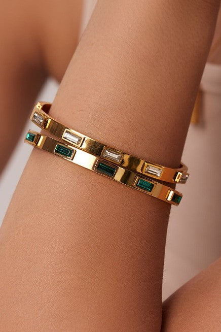 Luxurious yet tarnish-proof, this slim 18K gold-plated stainless steel bangles shines with alternating emerald-green or crystal-clear baguette stones. Crafted from high-quality stainless steel with a real 18K gold dip design to be waterproof and tarnish-resistant.