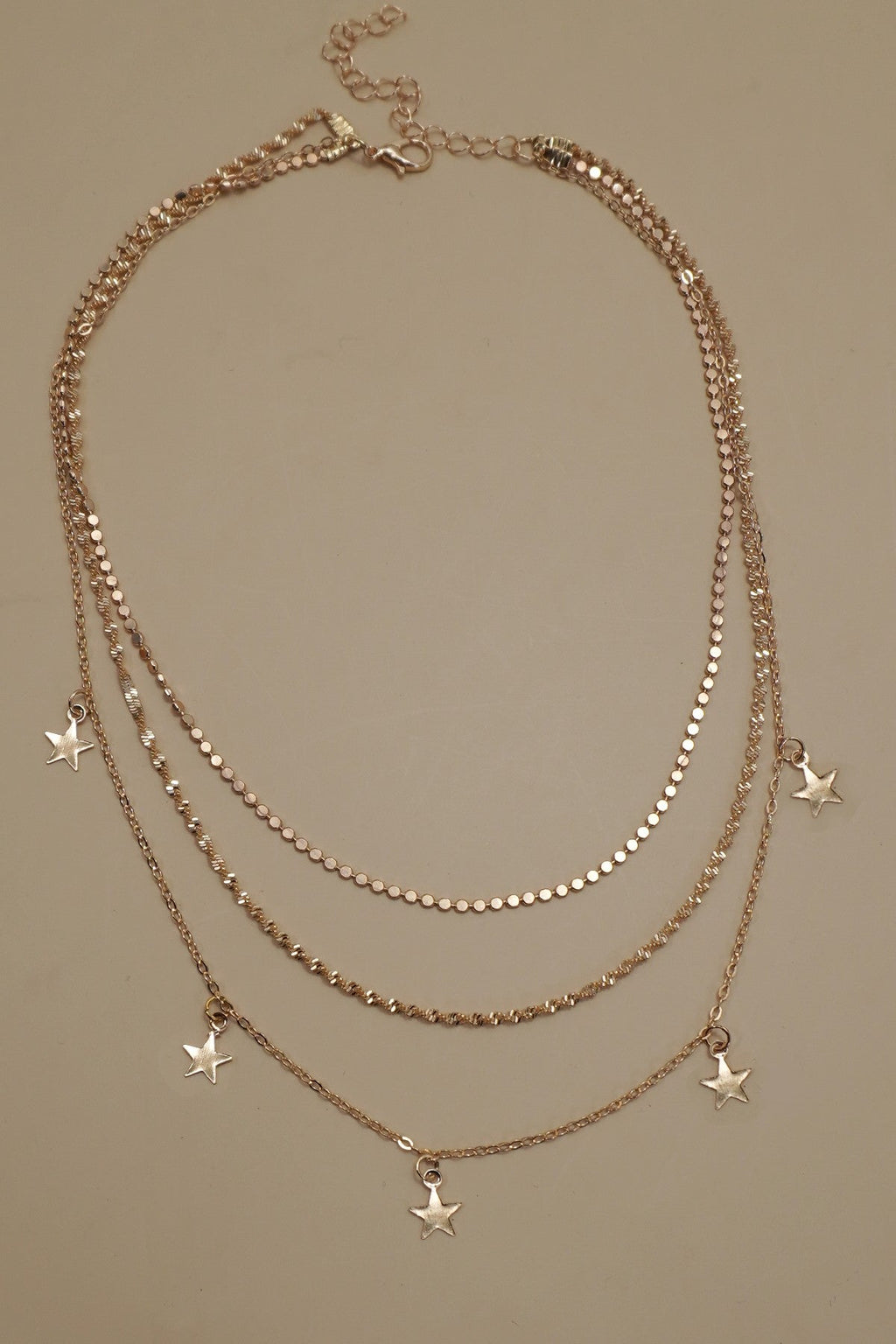 18K Stainless Steel Tarnish-Free Layered Necklace. Multi star pendant with layered chain Necklace, crafted from 18K stainless steel, this necklace is designed to be tarnish-free, ensuring it maintains its brilliant shine and impeccable condition over time. Hypoallergenic properties, making it suitable for individuals with sensitive skin or metal allergies.