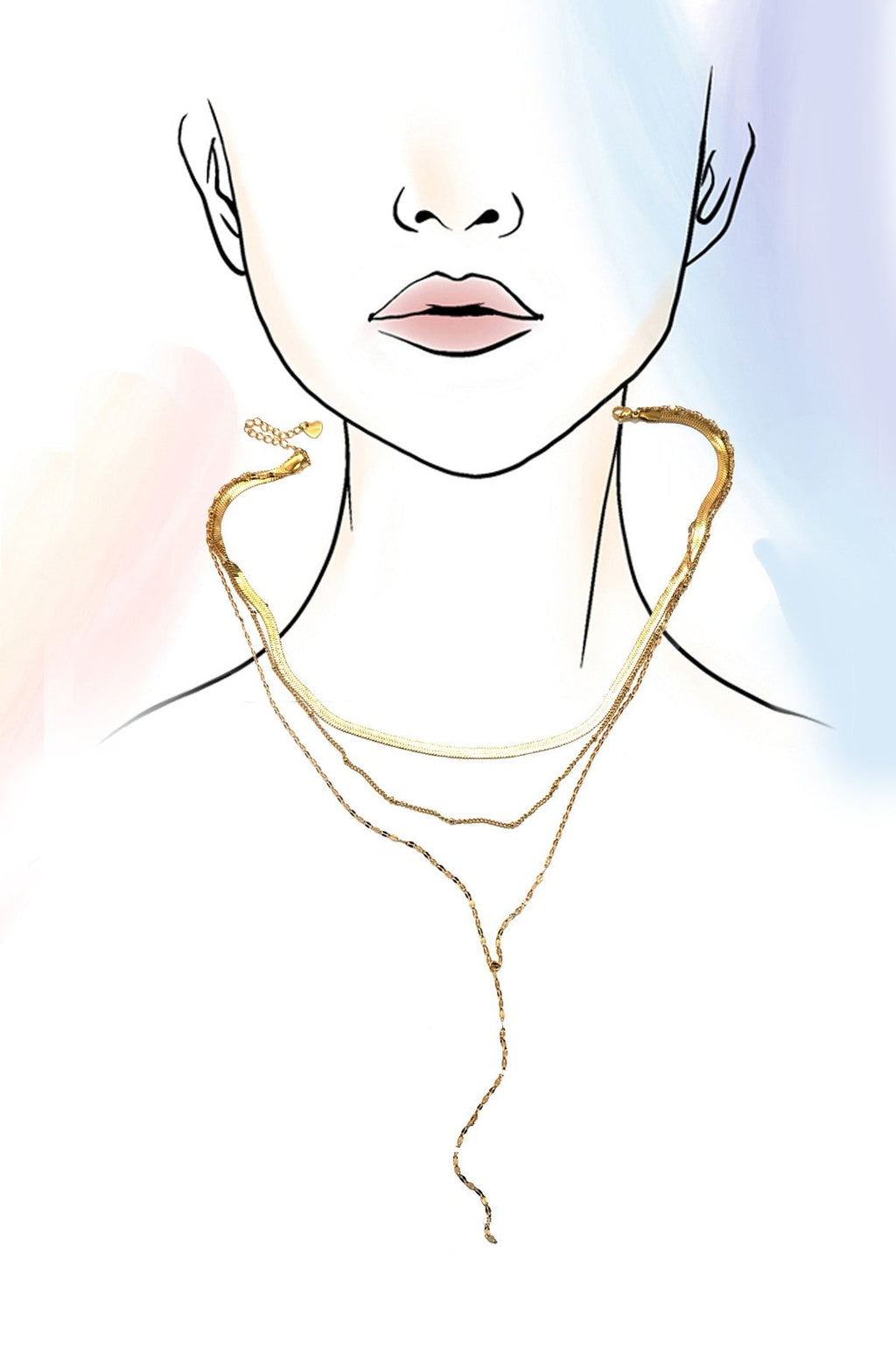18K Stainless Steel Tarnish-Free Station of Layered Y Necklace. Crafted from high-quality stainless steel with an 18K gold finish, this necklace is designed to resist tarnish and maintain its brilliance. Featuring layered herringbone and ball chain along a delicate Y-shaped drop. Perfect gift for the holidays, including Christmas, Mother's Day, Valentine's Day, Easter.