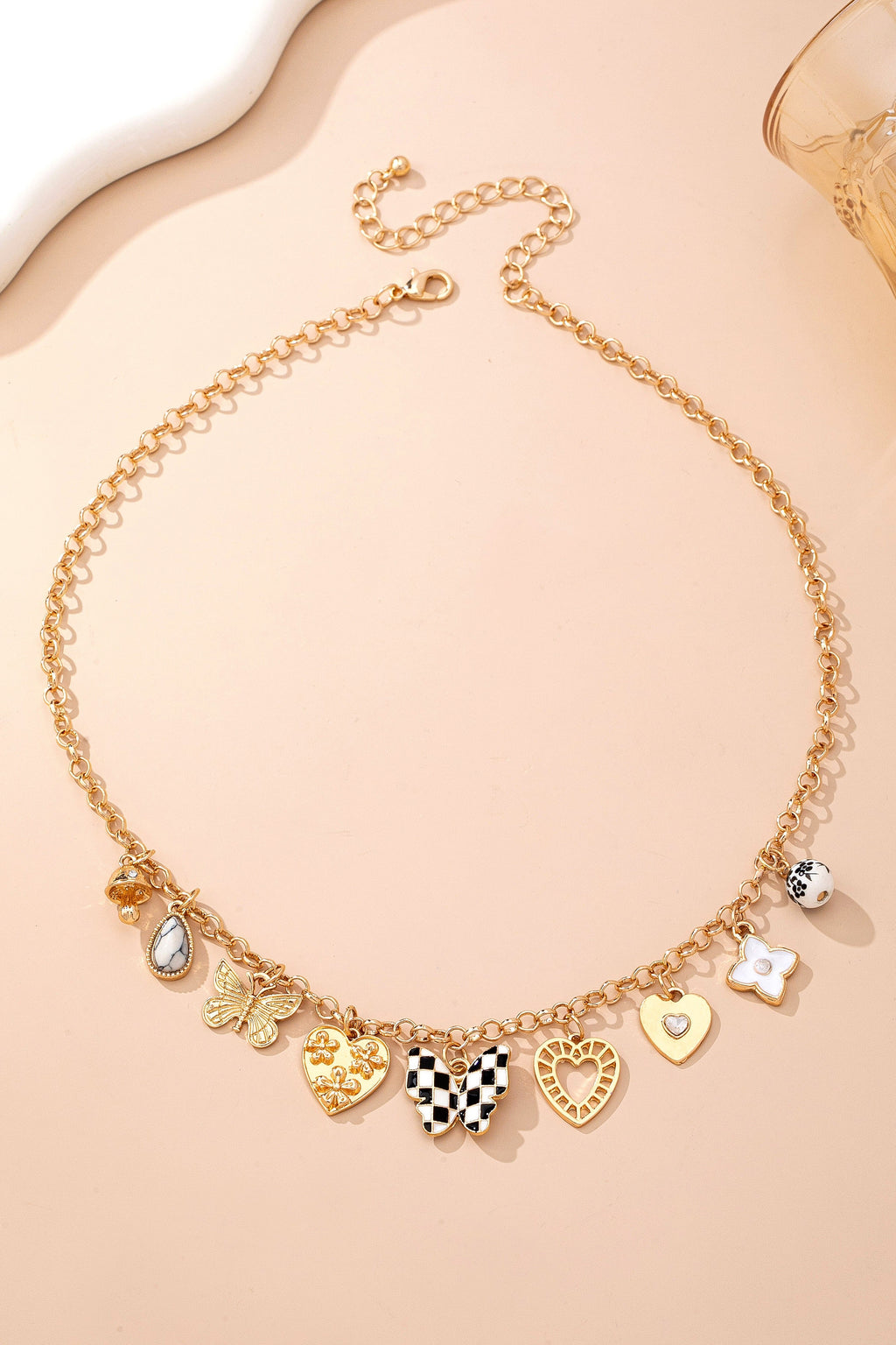 Featuring shiny gold hearts, intricate checker butterfly motifs, delicate enamel flowers, a bold black-and-white checkered heart, sparkling crystal accents, and glossy pearl-like beads, each charm adds a fun, feminine touch full of personality.