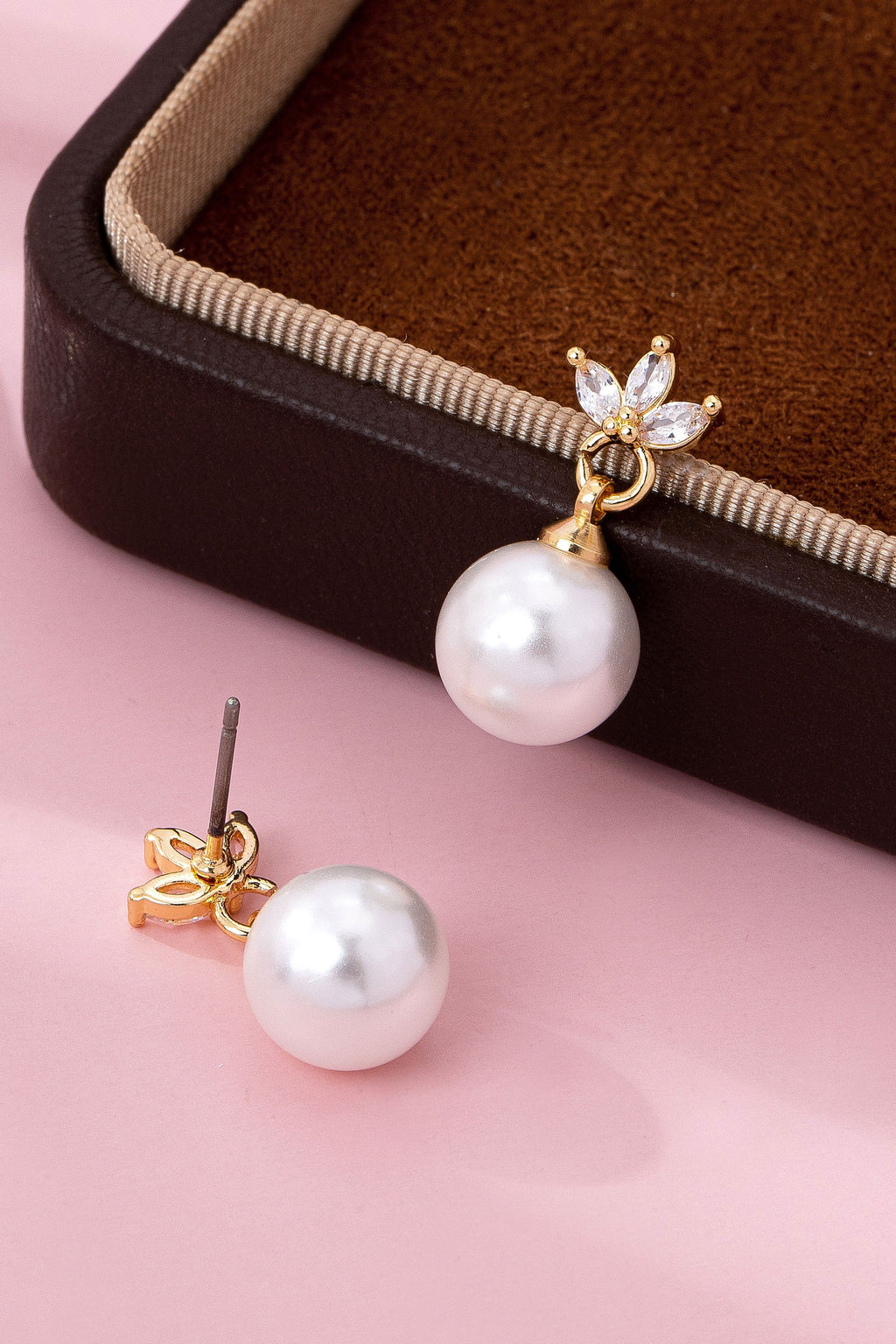 Features a brilliant stud designed as a CZ Crystal three-petal blossom, intricately crafted from high-clarity, CZ crystals that catch and reflect light beautifully. Suspended below is a smooth, lustrous ivory pearl.