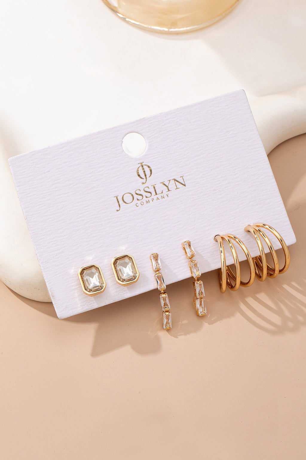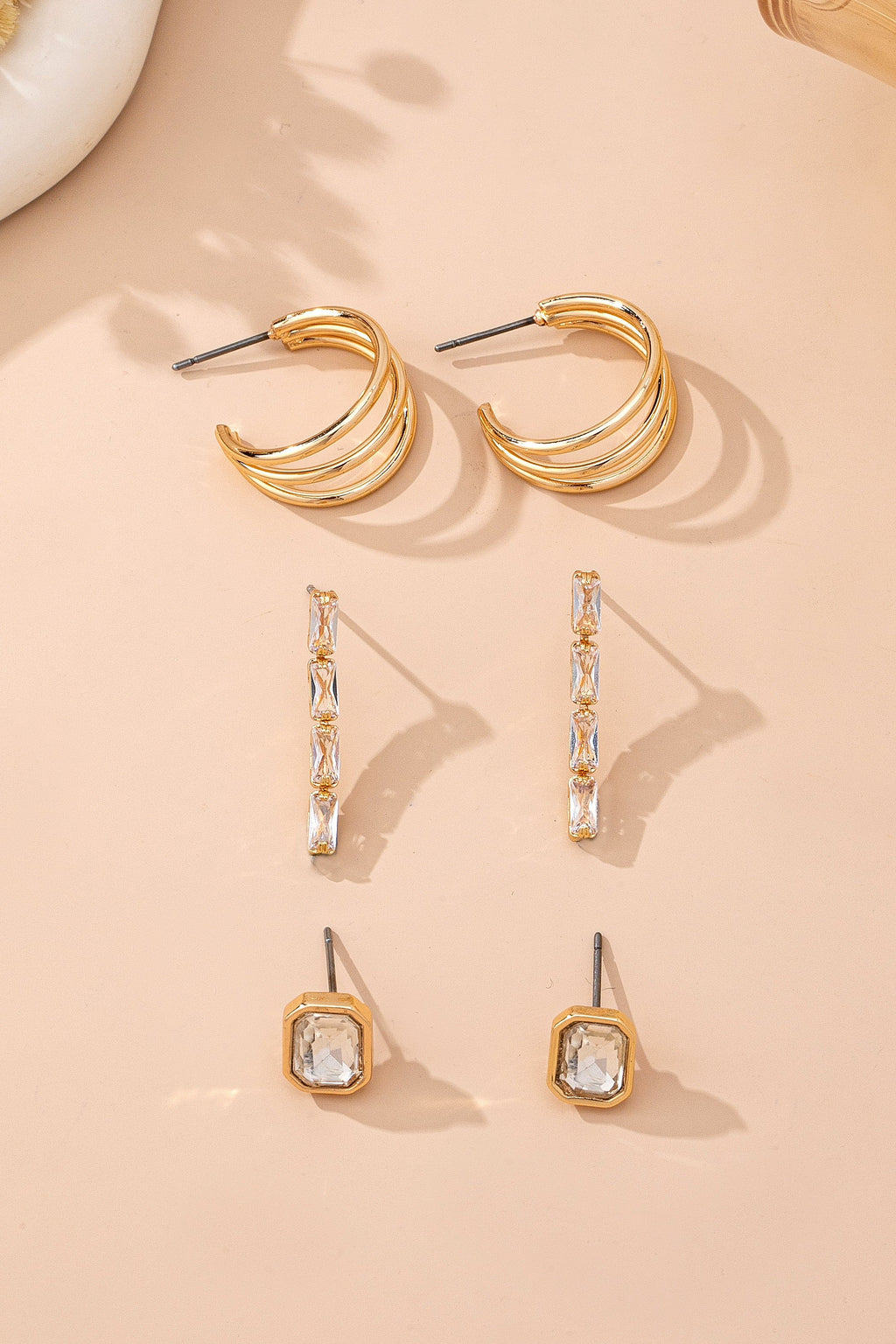 Versatile trio of gold-tone earrings featuring sparkling clear crystals: classic emerald-cut studs, curved baguette linear drops, and sleek triple hoop huggies. Mix of timeless studs, elegant drops, and modern hoops for endless styling options