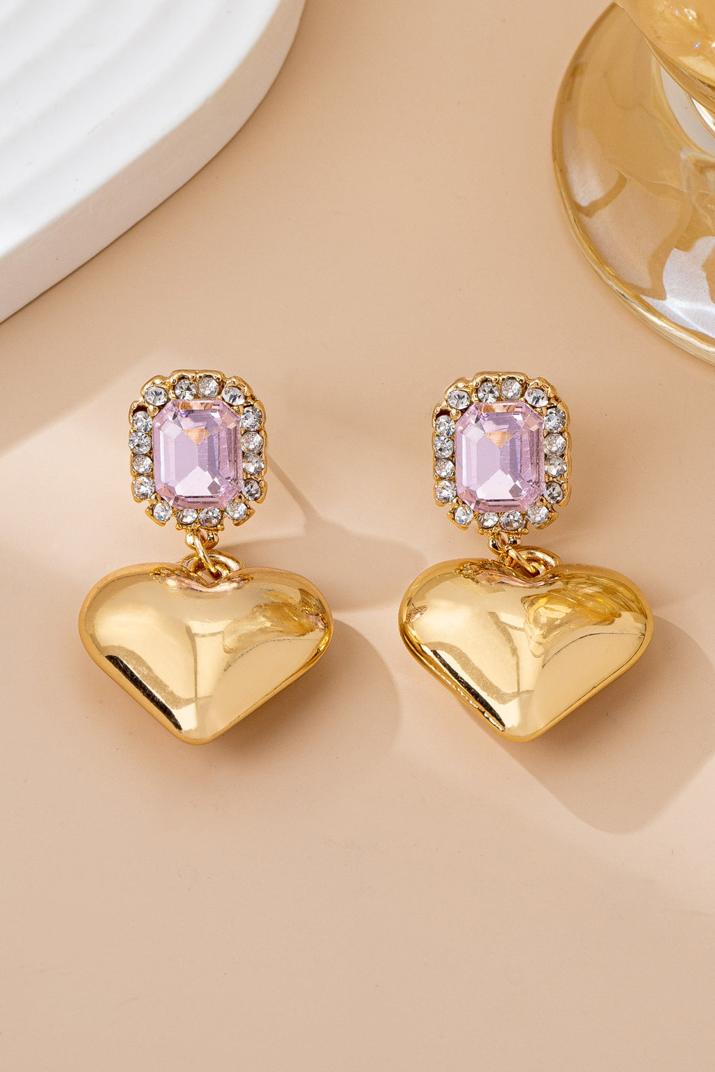 Gold-tone statement earrings feature a soft lt rose crystal rectangle crystal stud topped, oversized puffy heart drop. Lightweight yet dramatic, they bring instant feminine charm and subtle sparkle to any day or night look.