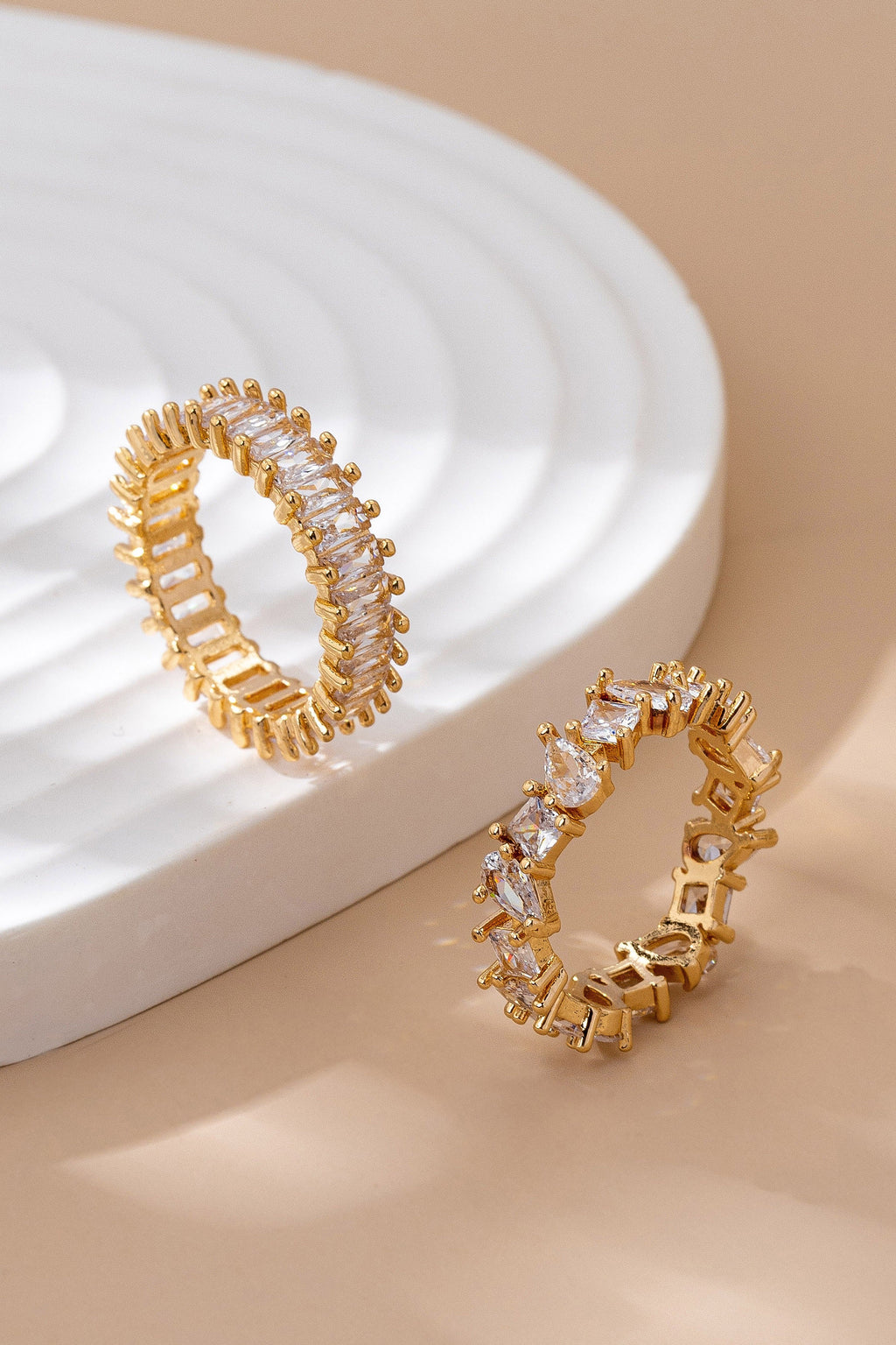 One gold-tone eternity ring lined with sleek zigzag teardrop-cut clear crystals for linear elegance, the other with alternating marquise and round cuts for dynamic brilliance. Lightweight, stackable, and perfect for everyday luxury or gifting sophisticated shine.