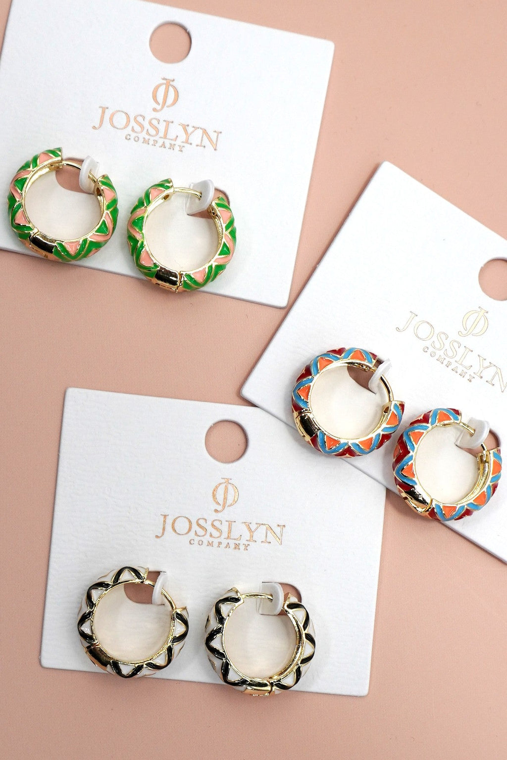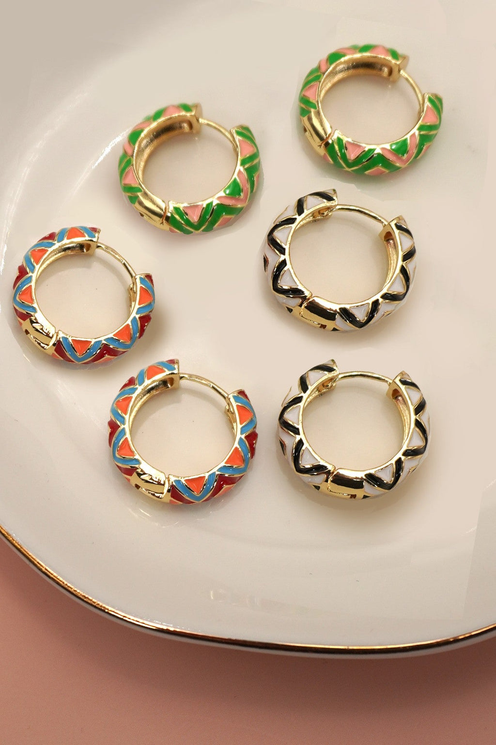 Stunning fusion of artistry and heritage. Handcrafted using the ancient cloisonne technique, these huggie hoops feature delicate aztec patterns in rich, natural enamel tones. Perfect gift for the holidays, including Christmas, Mother's Day, Valentine's Day.
