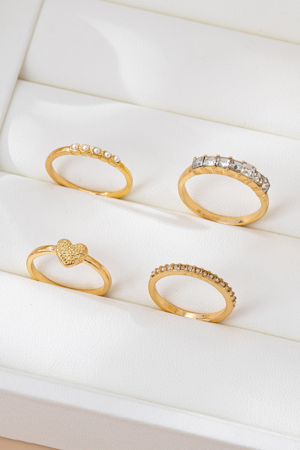 Four-ring gold-tone stack featuring sparkling clear crystals, delicate faux pearls, and a charming heart accent. Varied textures and designs create a sophisticated layered look can be worn separately.