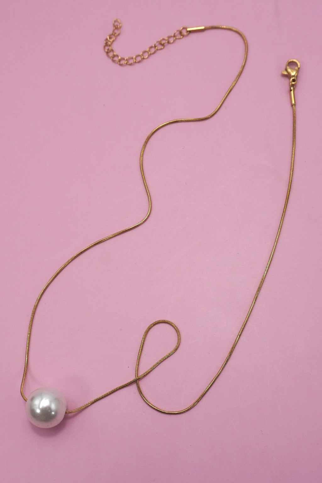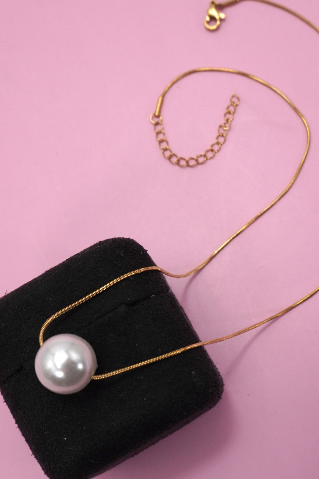 18K Stainless Steel Tarnish-Free Pearl Charm a snake chain necklace. Crafted from high-quality stainless steel with an 18K gold finish, this necklace is designed to resist tarnish and maintain its shine.