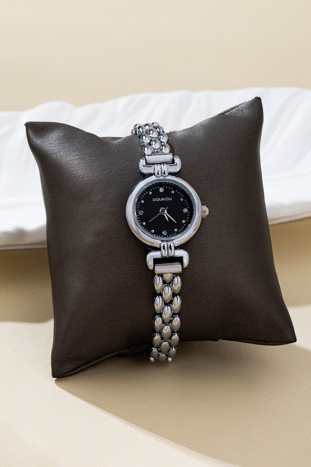 The watch face, a pristine white canvas, is adorned with minimalist hour markers and slender hands, ensuring effortless readability. A single, sparkling crystal accentuates the 12 o'clock position, adding a touch of subtle glamour without overwhelming the design. The watch is designed with a jewelry-style bracelet strap composed of small, textured metallic links that give it a sophisticated, accessory-like appearance.